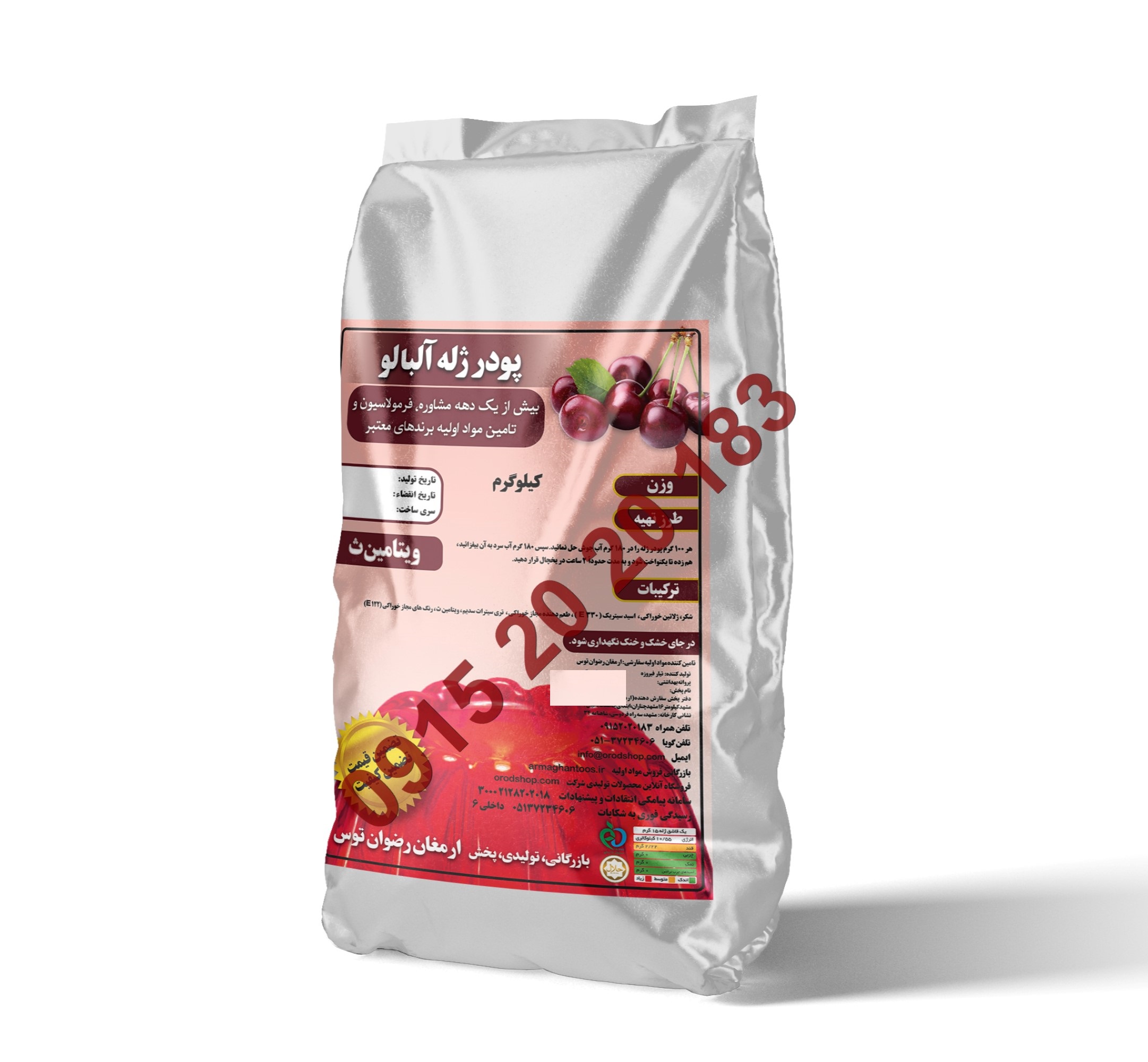 پودر ژله آلبالو 2 کیلوگرمی ویژه هتل ها و رستوران ها محصولی از شرکت ارمغان رضوان توس نام تجاری اُرُد شفافیت و حلالیت بالا